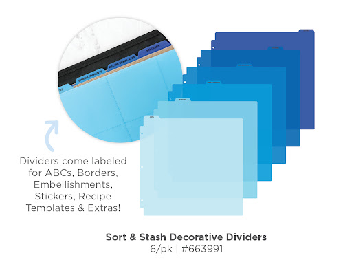The Sort & Stash Decorative Dividers include 6 labeled dividers (ABCs, Borders, Embellishments, Stickers, Recipes, Extras) to organize. Also comes with bonus stickers for custom labeling!